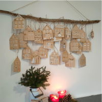 Domečky z papírových sáčků jsou jednoduché. Přehněte okraje, abyste vytvořili střechu a už jen namalujte domečky. Dírky na provázek můžete udělat nůžkami nebo děrovačkou. Nakonec do sáčků vložte dobroty nebo drobné dárky a zavěste na větev nebo jiné vhodné místo.