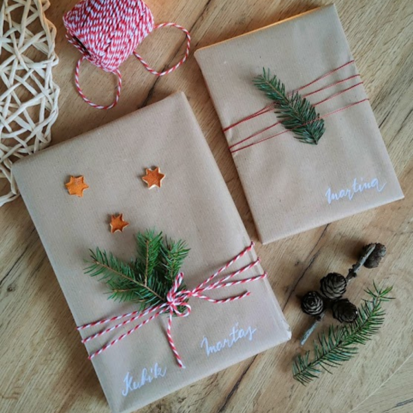 V posledních letech jsem si oblíbila obyčejný kraftový balicí papír, který doplňuji jutovými provázky, přízí na pletení a dozdobím přírodními materiály. Bílým fixem na balící papír maluji jednoduché obrázky nebo jména.