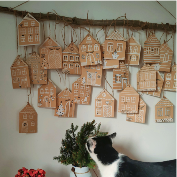 Domečky z papírových sáčků jsou jednoduché. Přehněte okraje, abyste vytvořili střechu a už jen namalujte domečky. Dírky na provázek můžete udělat nůžkami nebo děrovačkou. Nakonec do sáčků vložte dobroty nebo drobné dárky a zavěste na větev nebo jiné vhodné místo.