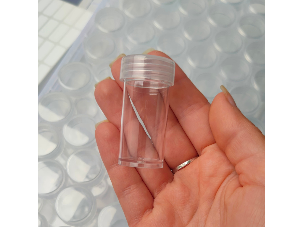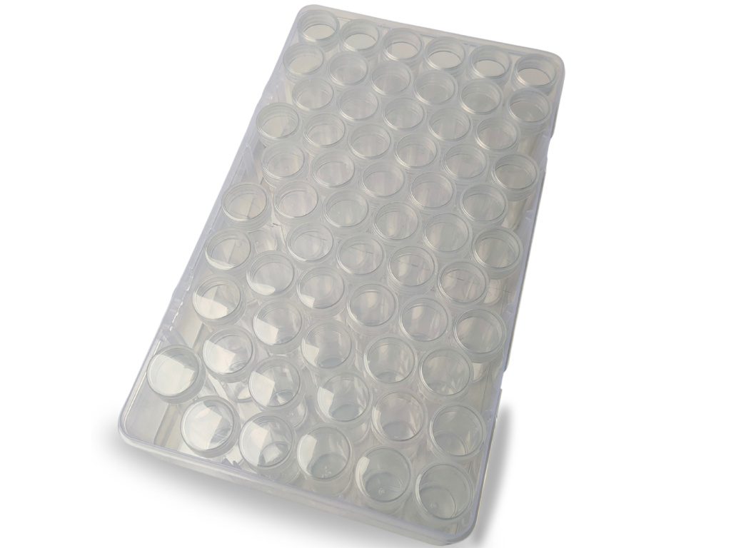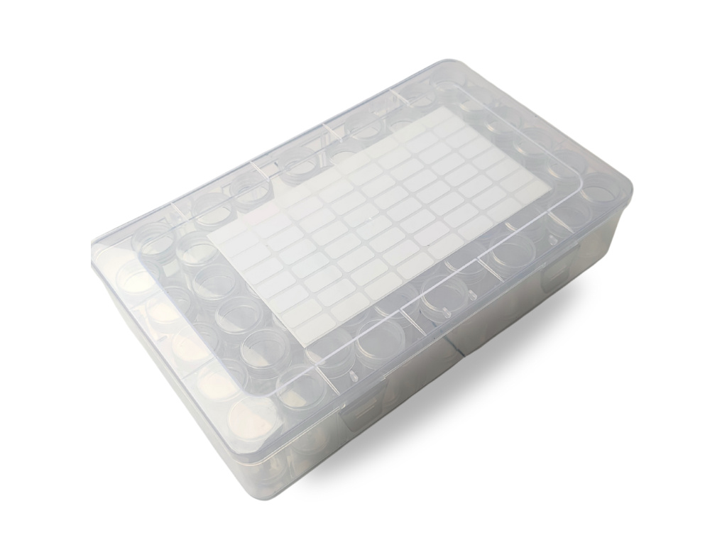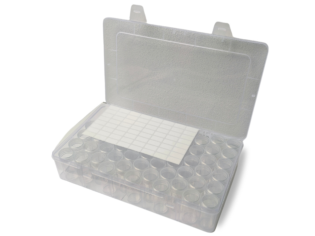 60 ks kulatých šroubovacích krabiček v praktickém boxu. Včetně bílých samolepek.