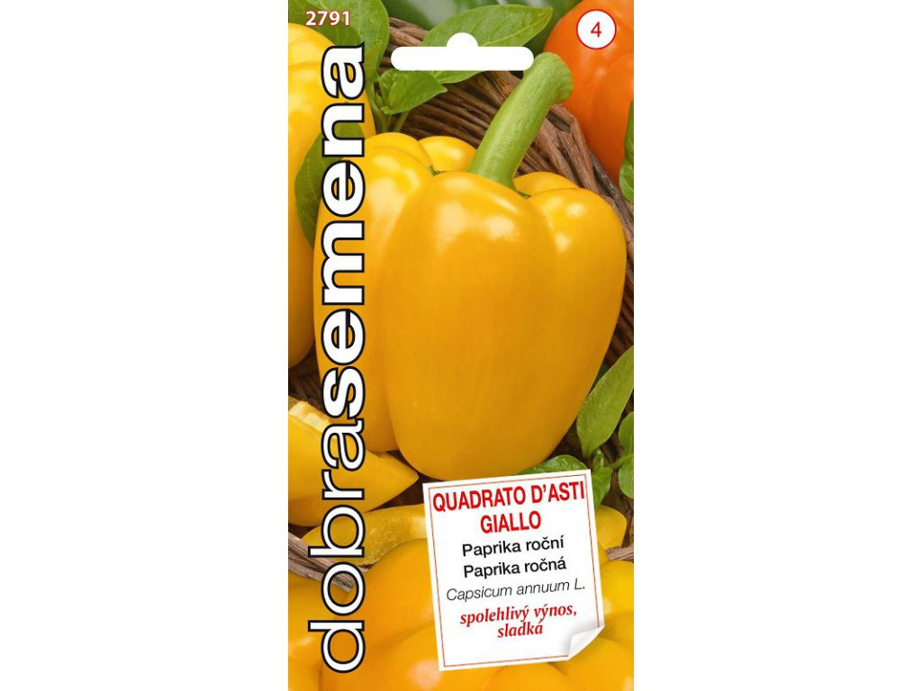 QUADRATO D´ASTI GIALLO ─ paprika s kvadratickými, hrubostěnnými, chutnými a aromatickými plody žluté barvy. Italská specialita s vysokým výnosem. Výborná za čerstva, na plnění, dušení i pečení. Pěstujte v krytých prostorech, nebo na záhřevné, plně osluněné lokalitě.