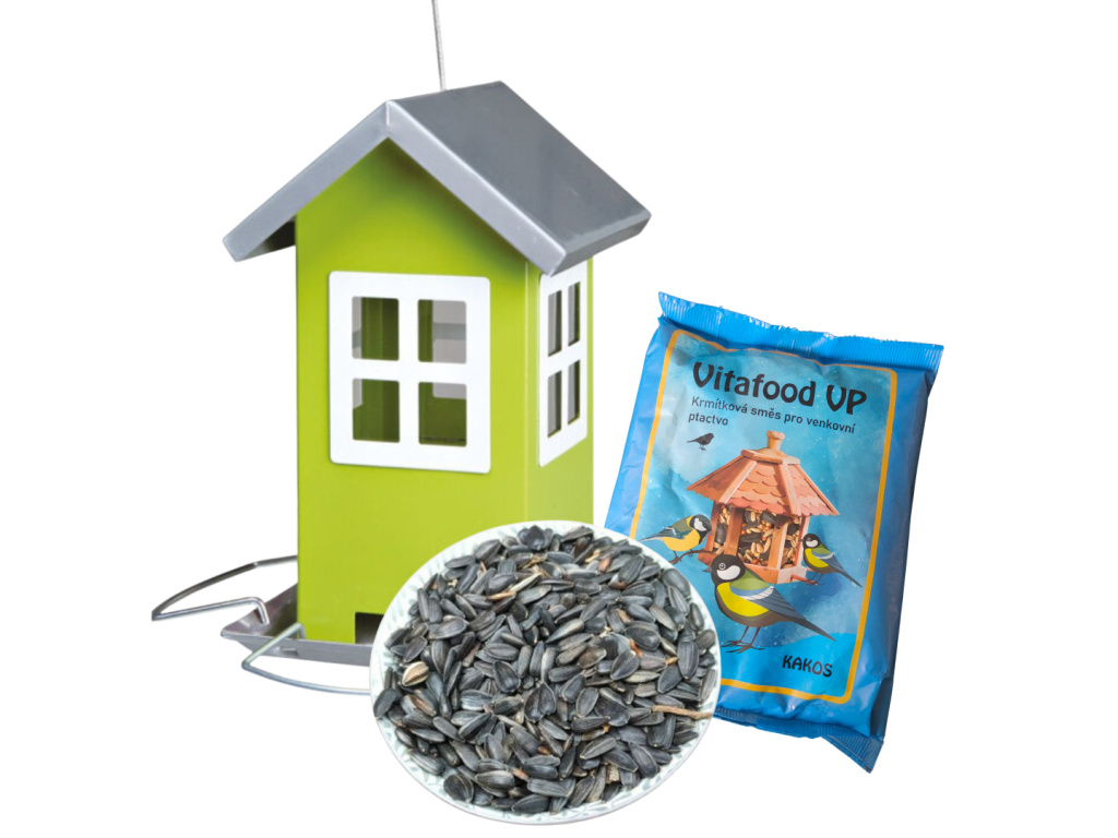 Cenově výhodný set krmítka a krmení pro venkovní ptáčky.