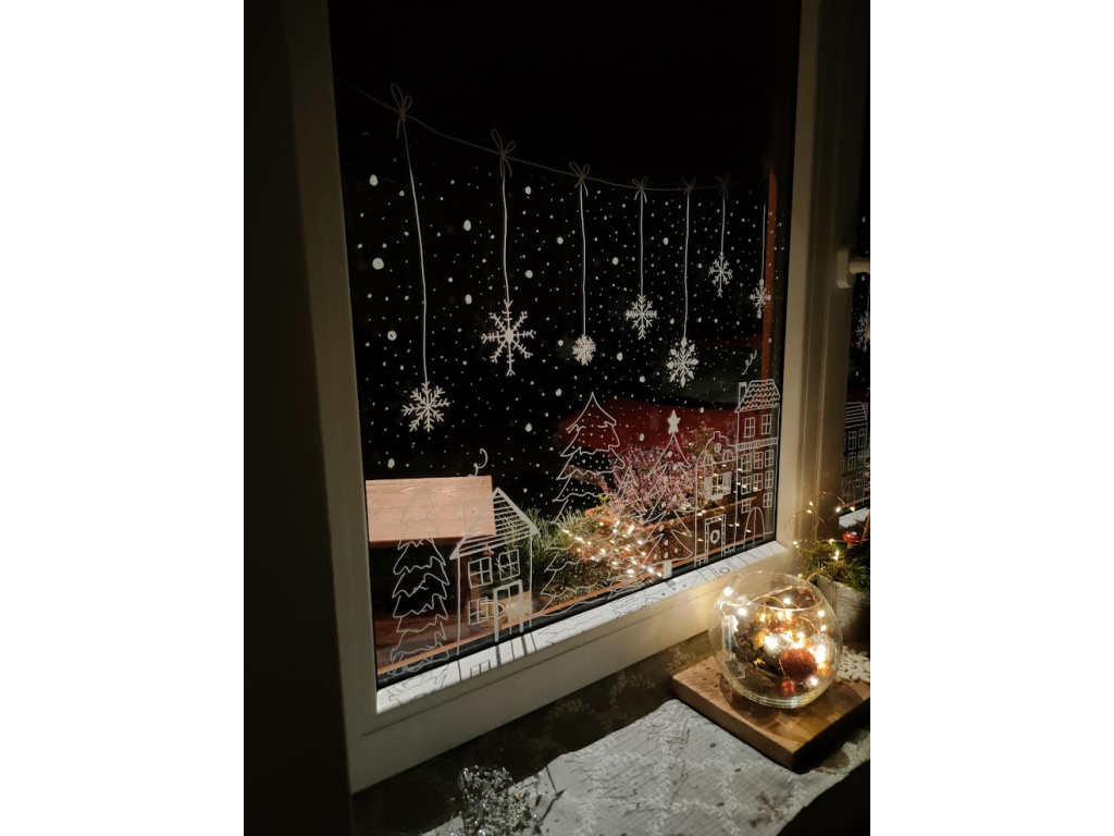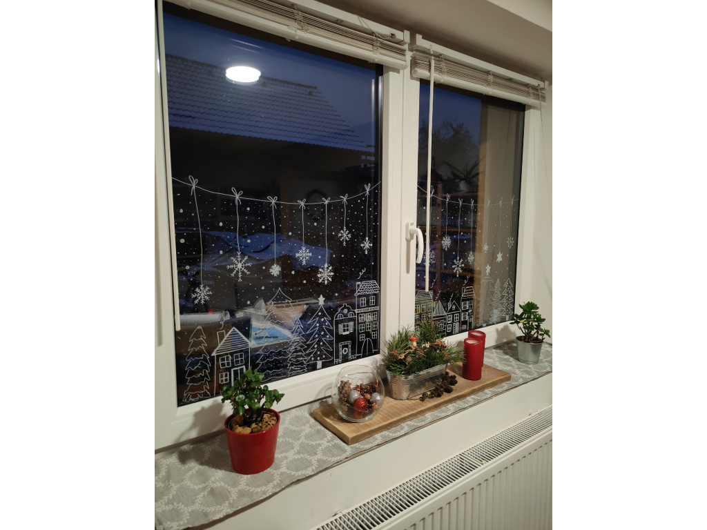 Pro malování větších ploch nebo prvků je vhodný křídový značkovač na okna o síle 3-4 mm. Ten však neodolává vodě při rosení oken, po namočení se barva rozpouští.